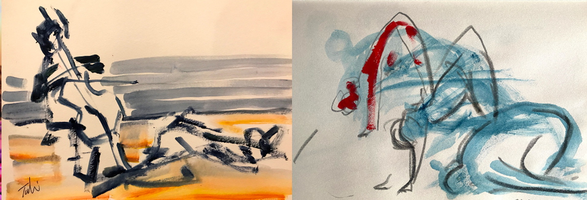 Niet alleen bezoekers, ook muzikanten komen tijdens een yogaconcert in een andere concentratie, een nieuwe creatieve laag terecht. De afgelopen jaren is er langzamerhand een kern ontstaan van muzikanten die ik op deze pagina introduceer (met onderaan een overzicht van alle muzikanten die de afgelopen jaren deelnamen). De tekeningen hieronder zijn tijdens een yogaconcert gemaakt door live painter Tali Farchi.
