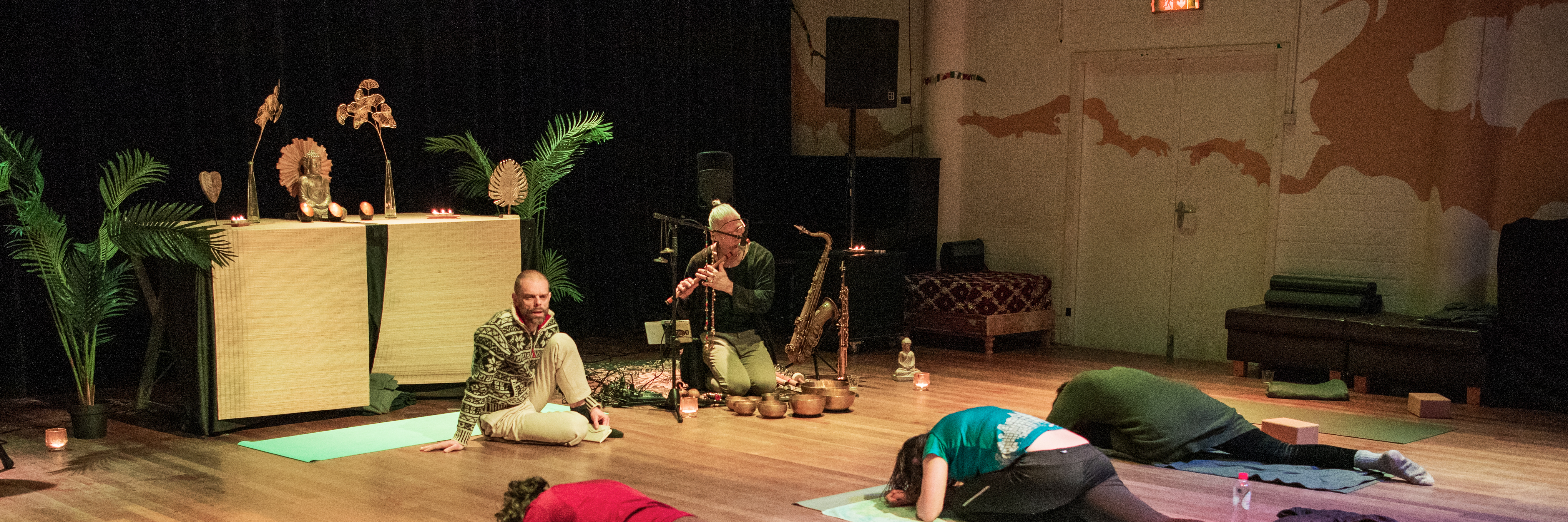 Wouters activiteiten zijn te volgen via facebook. De foto hieronder is van een legendarisch yogaconcert in de Jungle, waar ik het laatste sonnet voor Orpheus van Rainer Maria Rilke voordraag - en de rieten dwarsfluit, dat is dus een bansuri.